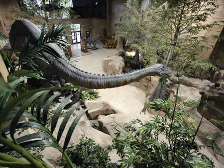 Here you can see the lobby with beautiful dinosaur animatronics, and stunning landscaping.